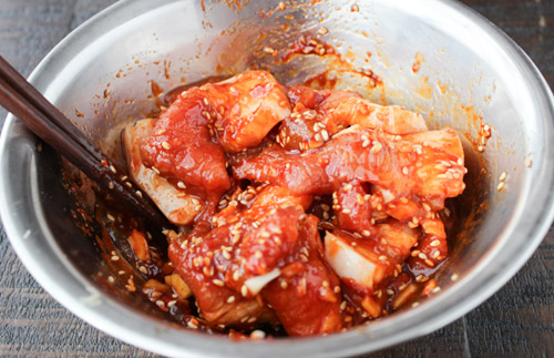 Thịt ba chỉ rửa sạch, thái miếng vừa ăn rồi đem ướp với tỏi, gừng, tương ớt, mật ong, xì dầu, dầu mè, vừng rang trong khoảng 20 phút.