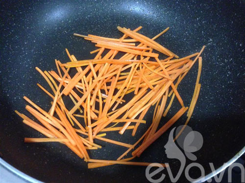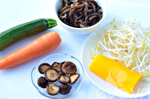 Thái sợi cà rốt, bí ngòi và mộc nhĩ, nấm hương.