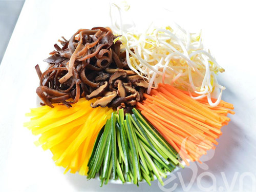 Xếp lần lượt thịt bò, các loại rau củ đã làm chín và củ cái muối thái sợi lên trên mặt. Đập một quả trứng cho vào giữa bát (có thể chiên trứng lên sẵn nếu muốn).