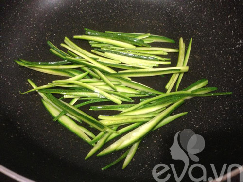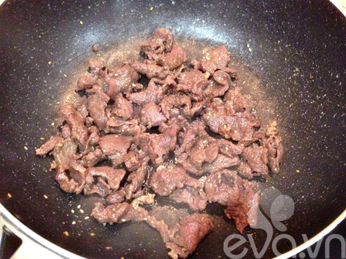 Phi tỏi thơm, xào săn thịt bò với xì dầu, rắc thêm một chút tiêu và vừng rang cho thơm.