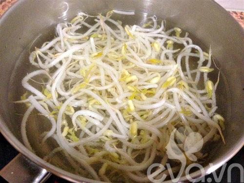 Bước 4: Chần sơ giá đỗ trong nước có nêm chút muối. Vớt ra, nhúng qua nướng lạnh rồi để ráo. Trộn đều giá với một ít dầu vừng và gia vị.